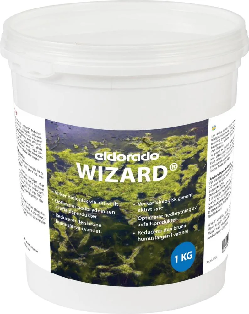 NYT NAVN – Biologisk balance Den aktive ilt i Wizard® forbedrer havedammens biologiske selvrensning, idet de nedbrydende bakterier arbejder hurtigere og mere effektivt. Pga. Wizard®s oxiderende effekt sikres rent og klart vand. Også den brune humusfarve i vandet reduceres ved oxidation. Skader ikke fiskene. Brugsanvisning: Pr. 1000 ltr damvand bruges 50 gram Wizard® som strøs jævnt ud over vandspejlet. Denne behandling foretages efter behov 2 til 3 gange med et par dages mellemrum. Kan bruges forebyggende ved anvendelse af 20 gram pr. 1000 ltr damvand. Én gang ugentligt eller efter behov. Wizard® bruges kun når pH-værdien er under 8,6. Undgå at strø Wizard® direkte på vandplanter, da løvet derved kan skades. Sikkerhed Faremærket med Lokalirriterende og Brandnærende