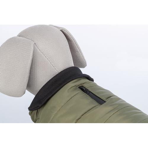 For at sikre en perfekt pasform har frakken en justerbar elastisk hagesmæk, der kan tilpasses efter din hunds halsstørrelse. Dette bidrager til at forhindre, at vand og kulde trænger ind under frakken.