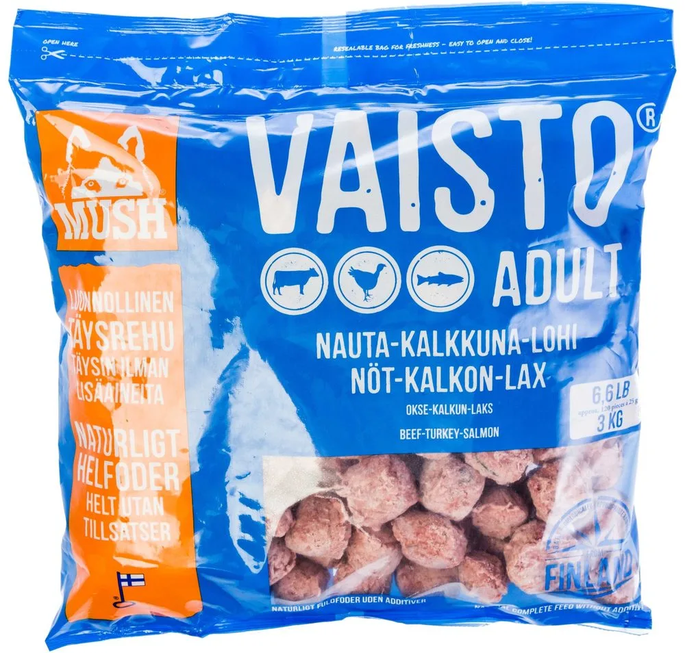 Vaisto® Blå (okse, kalkun, laks) er godt for hundens hud og pels og er et godt valg til f.eks. hunde, som har tør hud, eller som foder i de kolde og våde årstider.