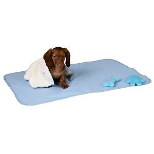 Farve: Blå Størrelse: 76x50cm Materiale: Fleece, Plys Hvalpesæt : Fleece tæppe, 76 × 50 cm (maskinvaskes op til 30 °C). Microfiber håndklæde, 50 × 40 cm (maskinvaskes op til 60 °C). 2 stk. plys legetøj