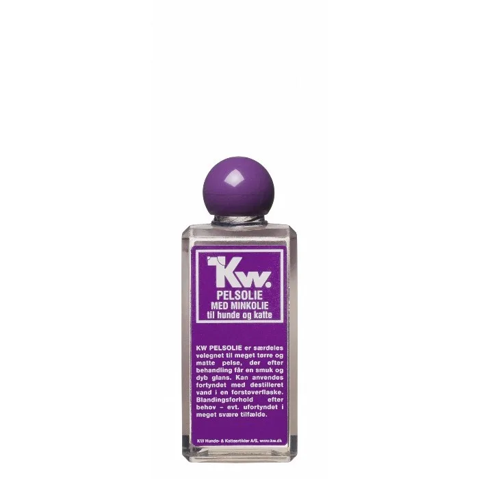 KW PELSOLIE MED MINKOLIE 200ML KW PELSOLIE er særdeles velegnet til meget tørre og matte pelse, der efter behandling får en smuk og dyb glans. Kan anvendes fortyndet med destilleret vand i en forstøverflaske. Blandingsforhold efter behov evt. ufortyndet i meget svære tilfælde.
