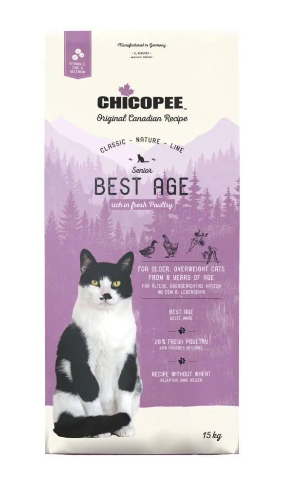 OBS 15 kg kun til afhentning i butuk !! Senior BEST AGE Højt indhold af frisk fjerkræ Til ældre, overvægtige katte fra 8 år – Bedste alder – 20% fersk fjerkræ – Skin & Coat E vitamin, Selen & Zink E vitamin, selen og zink understøtter din firbenede vens naturlige forsvar. Alle 3 komponenter har antioxidanternes egenskaber og kan reducere effekten af kroppens frie radikaler Optimal fordøjelse Gennem optimal udvælgelse af råmaterialer og en skånsom fremstillings proces, har vores Chicopee produkter en kalkuleret fordøjelse på over 90%. Skin & Coat De høje niveauer af værdifulde olier og fedt (inklusiv 1,5% lakseolie) kan få din kats pels til at se skinnende elegant ud og smidig. 20 % fersk fjerkræ Vores Chicopee produkter indeholder en høj andel af fersk kød fra fjerkræ. Fersk fjerkræ er særdeles let fordøjeligt og en næringsrig kilde til protein, hvilket støtter op om smagsoplevelsen af foderet. Analytiske bestanddele Protein 29,50 % Fedtindhold 12,50 % Råfiber 3,40 % Rå aske 6,40 % Calcium 1,10 % Fosfor 1,00 % Magnesium 0,11 % Omega-3-fedtsyre 0,50 % Omega-6-fedtsyre 2,20 % Tilsætningsstoffer: Ernæringsmæssige tilsætningsstoffer / kg Vitamin A 17.000 I. E. Vitamin D3 1.500 I. E. E-vitamin 250 mg Biotin 275 mcg Taurin 1.300 mg Sporstoffer Zink (som zinkoxid) 30 mg Zink (som aminosyrer zinkchelat, hydrat) 40 mg Kobber (cupric-sulfat, pentahydrat) 10 mg Jod (som calciumjodat, vandfri) 2,0 mg Selen (som natrium selenit) 0,2 mg Sammensætning Fjerkræ (frisk 20%), hvede, byg, majs, fedtstoffer (tørret), hvedemidlings, svinekødprotein (tørret), majsprotein, hydrolyseret protein, levermel, animalsk fedt, cellulose, hørfrø, fiskemel, pulveriseret æg, gær (tørret), calciumcarbonat, laksolie, ærter (tørret, 0,4%), kaliumchlorid, cikorie (tørret).