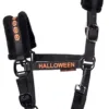 Grime med Halloween græskar print på næsen og Halloween i tekst på kindstykket. Polstret med blød sort kunstig pels. Justerbar på begge sider af hovedstykket og ved kæben. Hullerne er forsynet med øjer. Herunder et tov på 2 meter i længden.