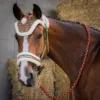Bring din hest i ultimativ julestemning med dette festlige grimesæt i et muntert juledesign. Grimen afsluttes med blød imiteret pels på nakke og næsestykke for ekstra komfort. Beslagene formet som juleklokker giver den et legende og unikt præg. Nakkestykket er justerbart på begge sider, hullerne er forstærket med robuste metaløjer, og sættet indeholder en matchende hut i julestil og et 2 meter langt reb. Et sjovt og behageligt sæt til at gøre din hest helt klar til ferien.