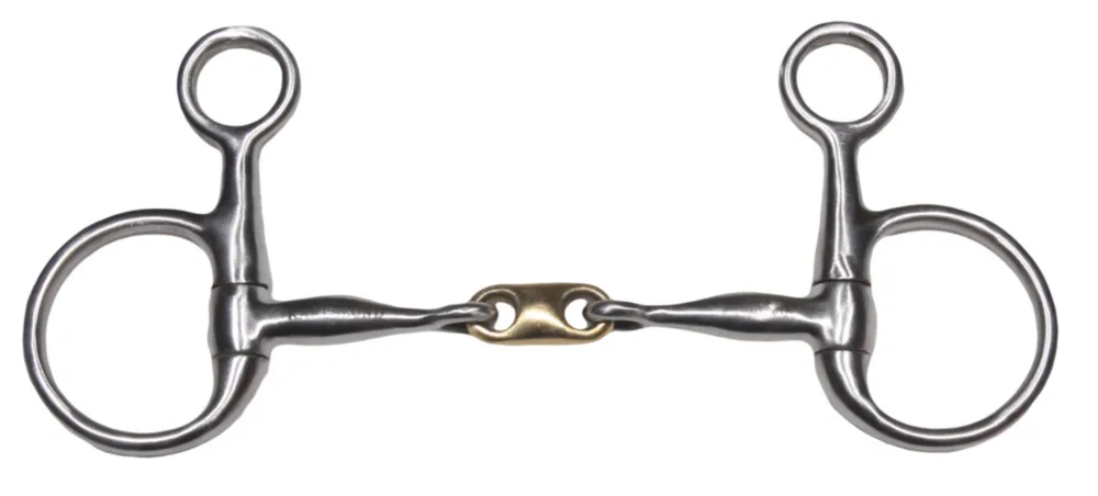 Tredelt B-bid med mild korrektion. Overflade i børstet stål og midterled i gul kobber. Egenskaber Høj kvalitet rustfri stål Midtlerled i gul kobber Baucher type sider Specielt designet til islandske heste Tykkelse: 12 mm.