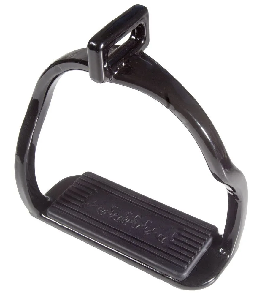 Dobbelt-S sikkerheds stigbøjler i aluminium. Gummiplader med töltene heste. Let og elegant design med lav vægt.