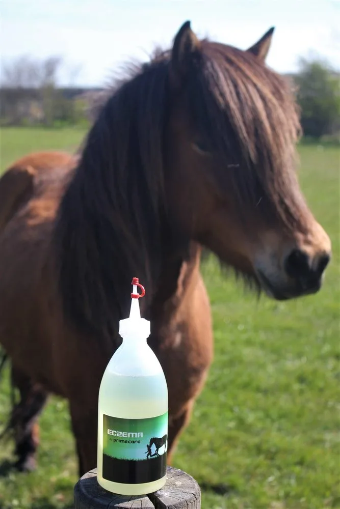 Flydende middel mod akut kløe, med svalende effekt Eczema sælges i en pipetteflaske, som har en praktisk størrelse og er nem at dosere ved man, ryg og halerod. Fjerner kløe efter kort tids brug. Forringer levevilkårerne for mitter og andre insekter Neutraliserer mitters spyt. Støtter heling af sår efter mitteangreb. Indeholder ikke forbudte stoffer i følge FEIs liste? Vejledende udsalgspris: 199,00 kr for 500 ml Baggrund Sommereksem er en kløende hudlidelse, der skyldes stik fra mitter. Heste på sommergræs er særligt udsatte. Lidelsen kan forekomme hele sommeren, men er specielt udtalt i maj og september. Hestene reagerer med en allergisk reaktion overfor mittens spyt. Hudforandringerne ved manke, ryg og halerod svarer til en bestemt mittes (culicoides pulicaris) foretrukne placering på hesten. Det er typisk, at ikke alle heste i samme fold er angrebet. Sommereksem kan ikke smitte fra hest til hest. Det er en udtalt lidelse hos islandske heste og ponyer, men andre heste kan også angribes. Symptomerne på sommereksem Hudforandringer i manke- og haleregion I starten ses rødme og dannelse af små væskefyldte blærer. Dernæst ses væskende eksem, med udsivning af serum, der tørrer ind til gullige skorper. Intens kløe. Hesten gnubber manke og hale, hvorved hårene slides af, og huden irriteres yderligere. Der kan opstå dybe sår på de angrebne områder Hvis sygdommen strækker sig over længere tid, slides halehårene næsten af, og huden bliver tyk og læderagtig. Kilde: Netdyredoktor Doseringsvejledning Skær toppen af den medfølgende pipettespids og påsæt den på flasken. Doser Eczema direkte i sårområder/irriterede områder. Sørg for at væsken kommer helt ned til huden. Massér væsken godt rundt i området. Brug gerne handsker. Behandlingen gentages dagligt indtil problemet er afhjulpet. Eczema vil danne bundfald over tid. Dette er uden betydning for effekten. Ryst evt. flasken før brug.