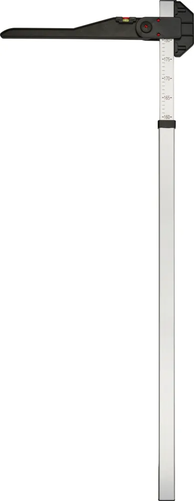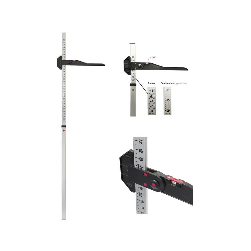 Stangmål i aluminium med teleskopfunktion til nem opbevaring. Store og tydelige talmarkeringer i tommer/fod på den ene side og centimeter/meter på den modsatte side. Bevægelig vandret plastbjælke med indbygget vaterpas til nøjagtig aflæsning.
