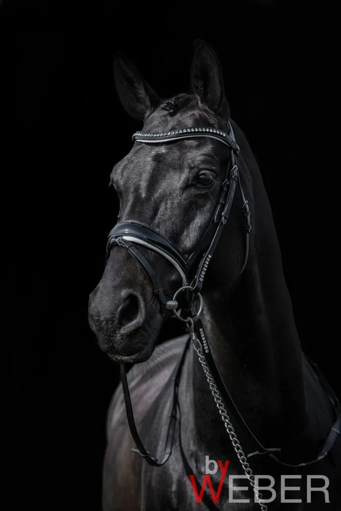Flot trense fra By Weber, med sten på sidestykker og tøjle, lak på pande og næsebånd. Bløde foringer og tilbage skåret nakkestykke, næsebånd tilbagetræk. Hvid foring