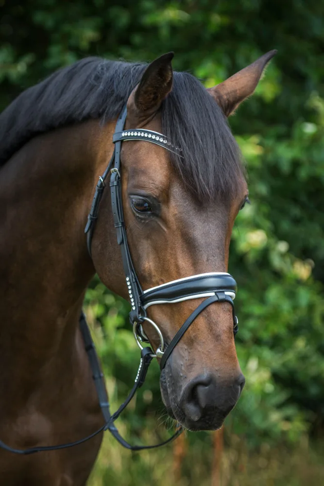 By Weber trense med hvide forringer, svarowski sten på buet pandebånd, på kindstykker og på tøjle som er en gummi tøjle med ribber. Næsebåd har tilbagetræk.