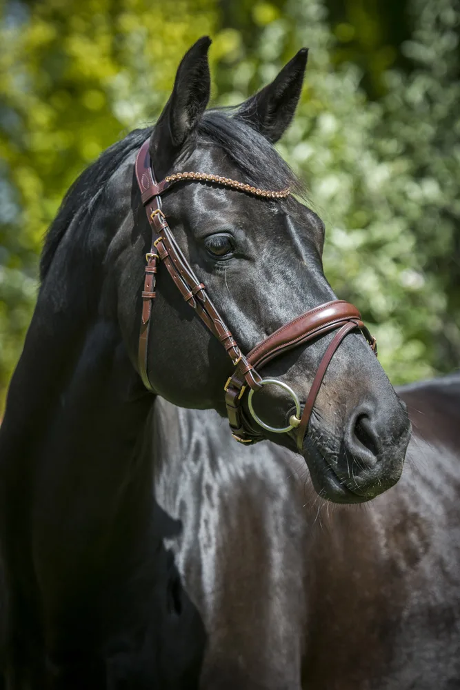 Super flot ny trense fra by Weber med rosegold sten og spænder i et lækkert forarbejdet engelsk læder.Trensen har anatomisk formet nakkestykke med blød foring, næsebåndet er også blødt forret og med tilbagetræk. Inklusiv læder tøjle med stoppere og gummigreb på inderside