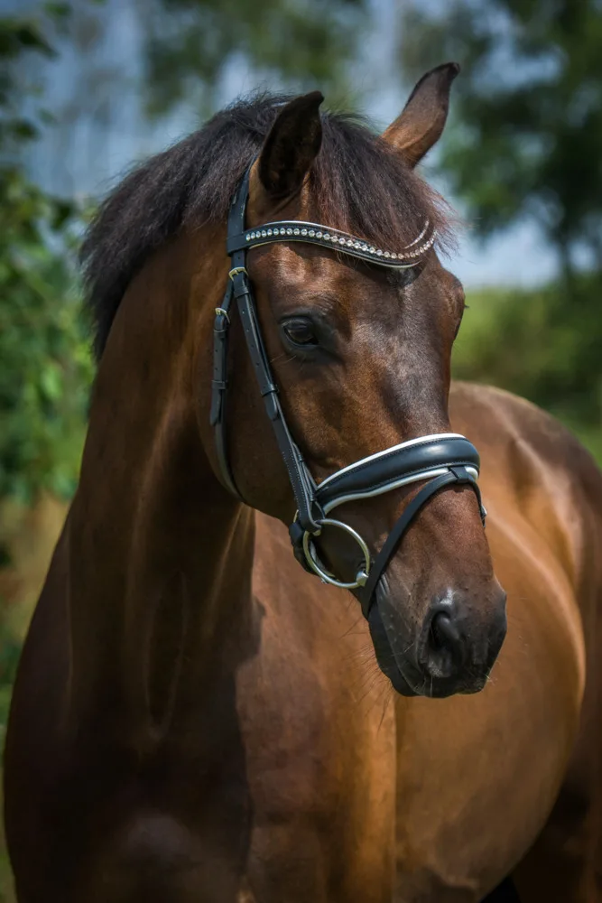 Klassisk trense med hvid foring, ergonomisk nakke og næsestykke. Pandebånd med Swarovski sten. Inkl. tøjler Farve Sort Str. Pony, Cob, Full, Xfull