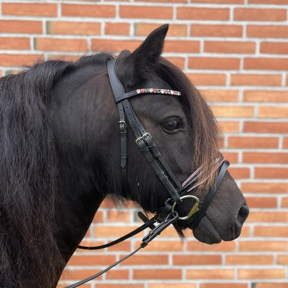Dolly Shetland Shetlands trense i en lækker kvalitet med ergonomisk nakkestykke og næsebånd. Næsebåndet er med tilbagetræk. Trensen har smukke Rivoli sten på pandebåndet, og små pink simili sten på næsebåndet. Der hører en supergrip tøjle med.