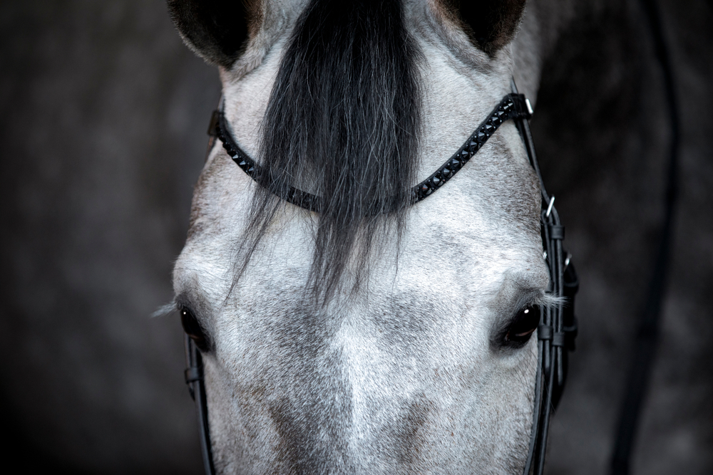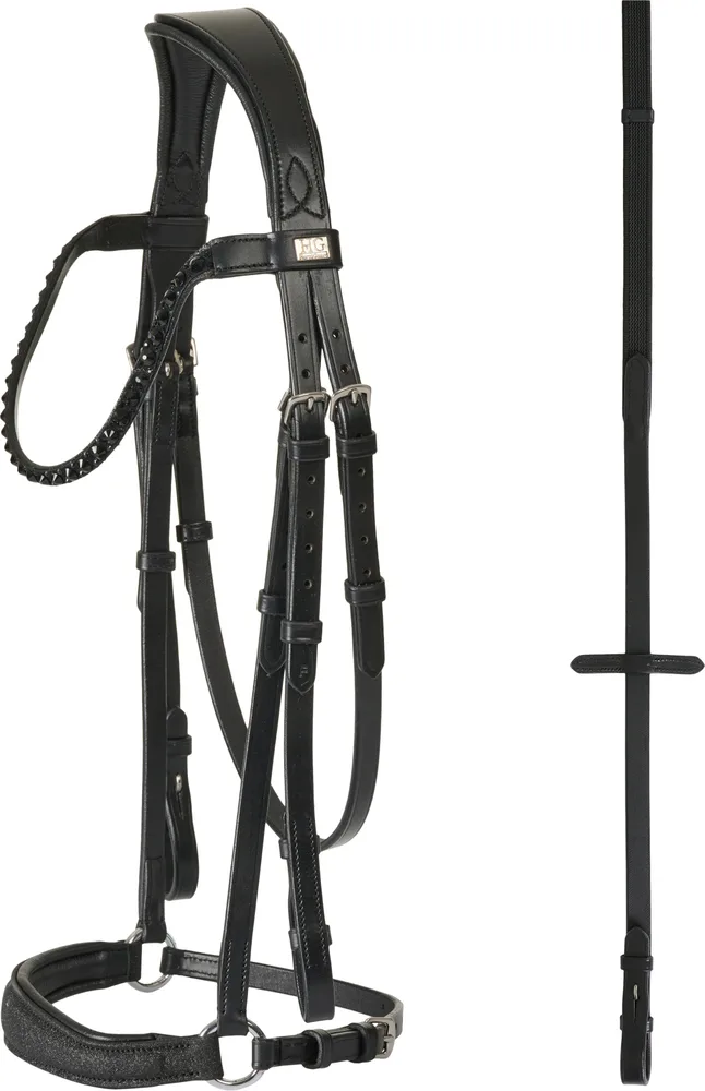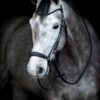 Lædertrense med hannoveransk næsebånd med blød polstring og glimmerfinish Specialdesignet nakkestykke med blød polstring for bedre komfort Buet pandebånd med skinnende sten Franske hager på tøjle. Leveres med 16 mm supergrip-tøjler. 100% læder