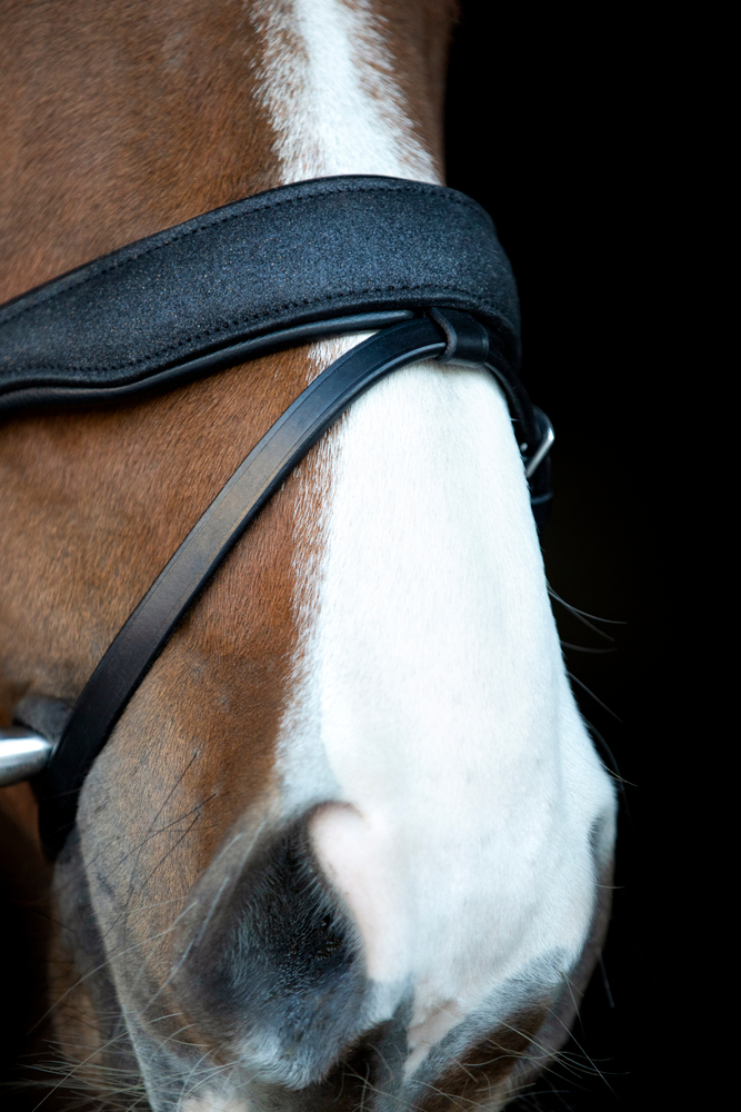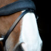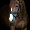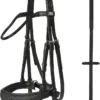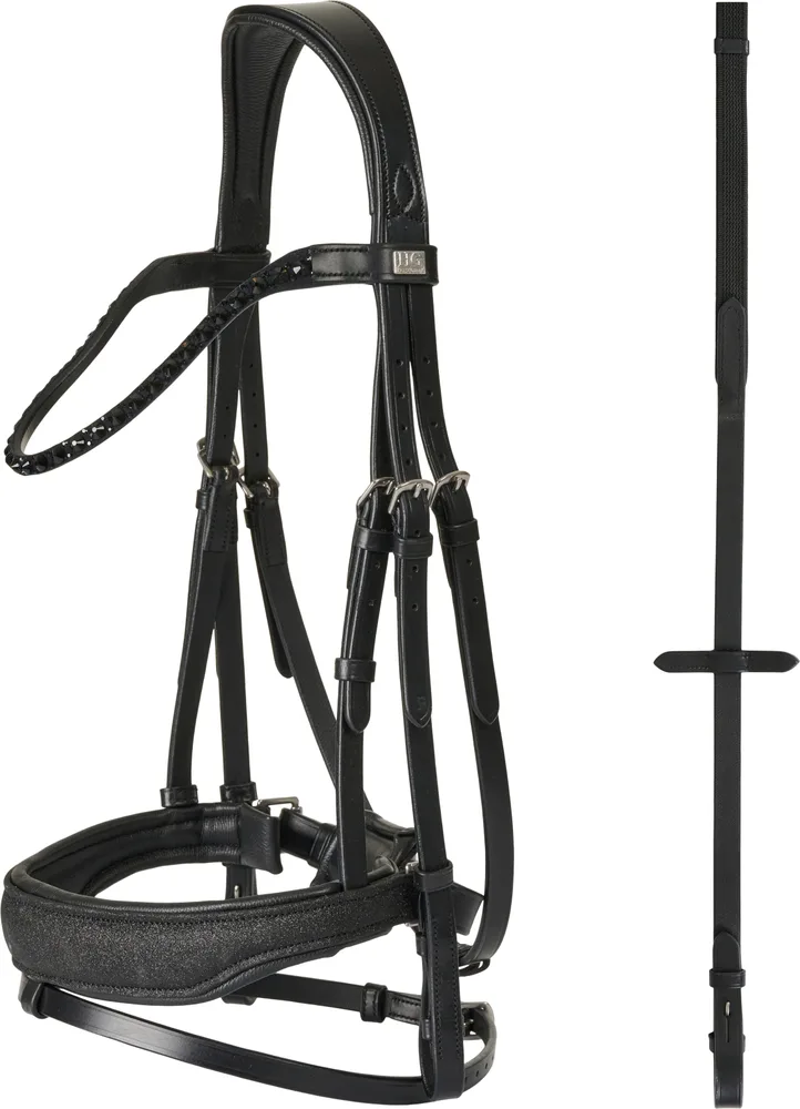 Trense med tilbagetræk. Polstret næserem med glimmerfinish Buet pandebånd med skinnende sten Ergonomisk formet nakkestykke for optimeret komfort. Fransk hager i tøjle. Leveres med 16 mm supergrip-tøjler. 100 % læder.