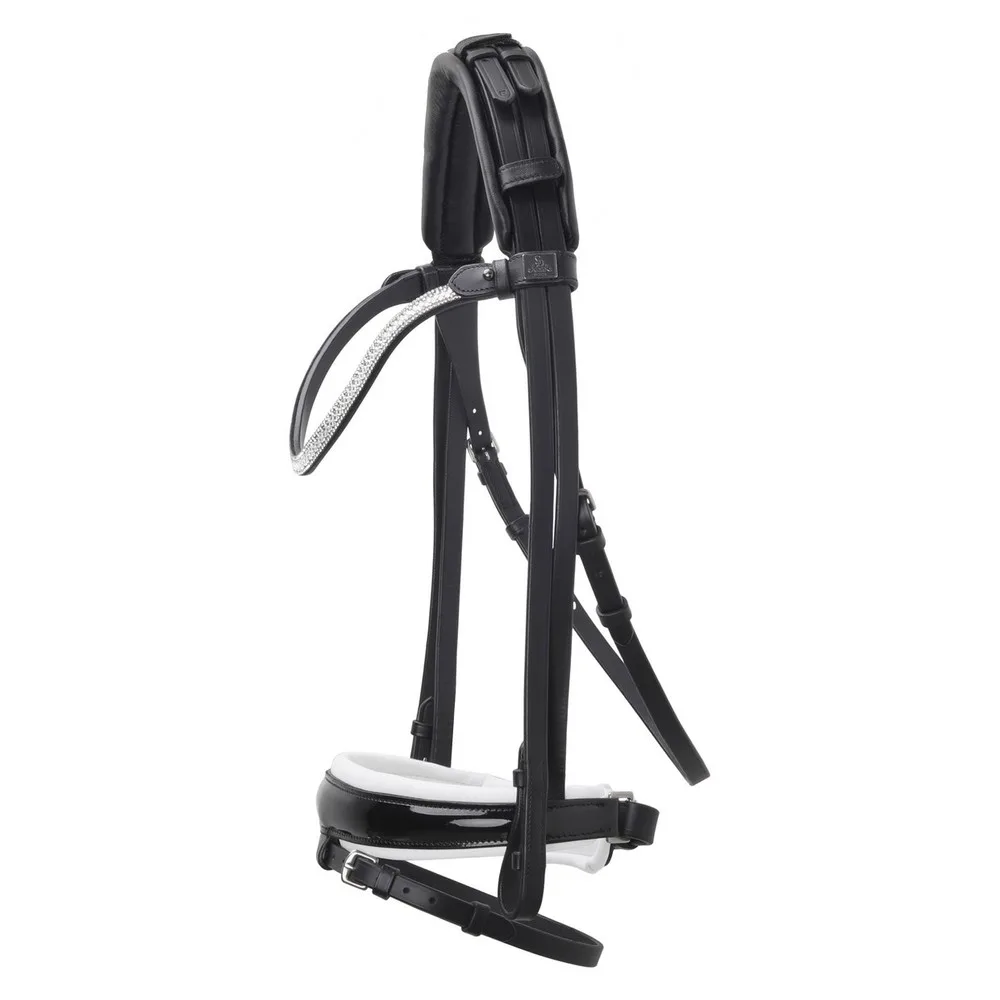 Ny lækker trense fra SD Design ingen spænder på sidestykke spændes i nakken som en rundsyet trense. Stort lækkert blødt nakkestykke Flot spejl pandebånd og lak på det brede polstrede næsebånd. Sælges uden tøjle-