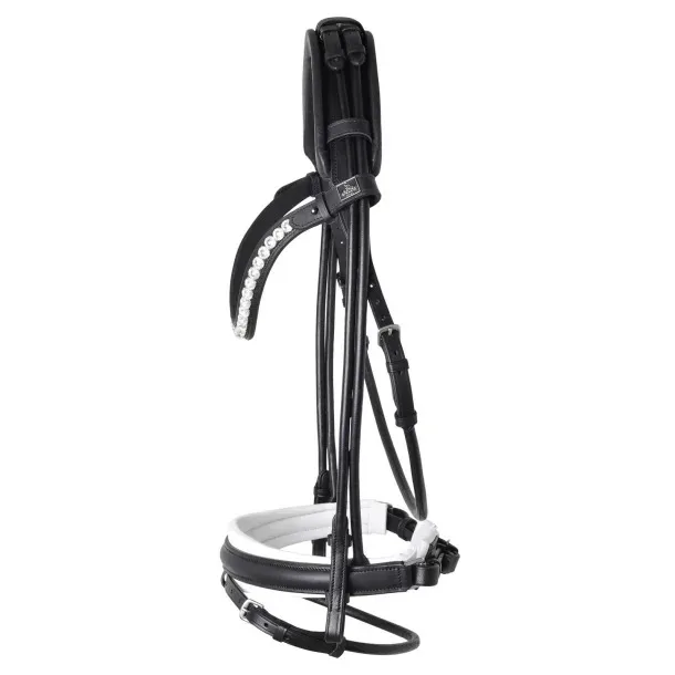 Næsebåndet er vores signatur design. Det er helt smalt ude i siderne, så der er god plads til biddet og det trykker ikke på de omkringliggende nerver. Foringen er så blød! Pandebåndet er smukt buet og virkelig elegant med en række 8mm Crystaller som glimtre om kap i solen.