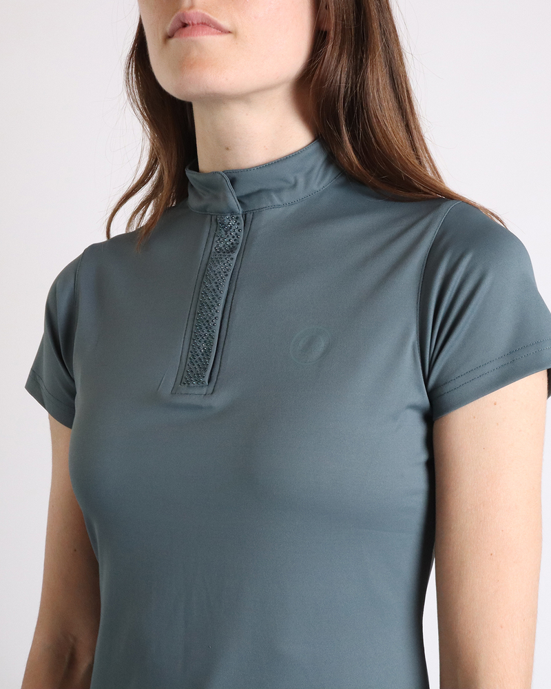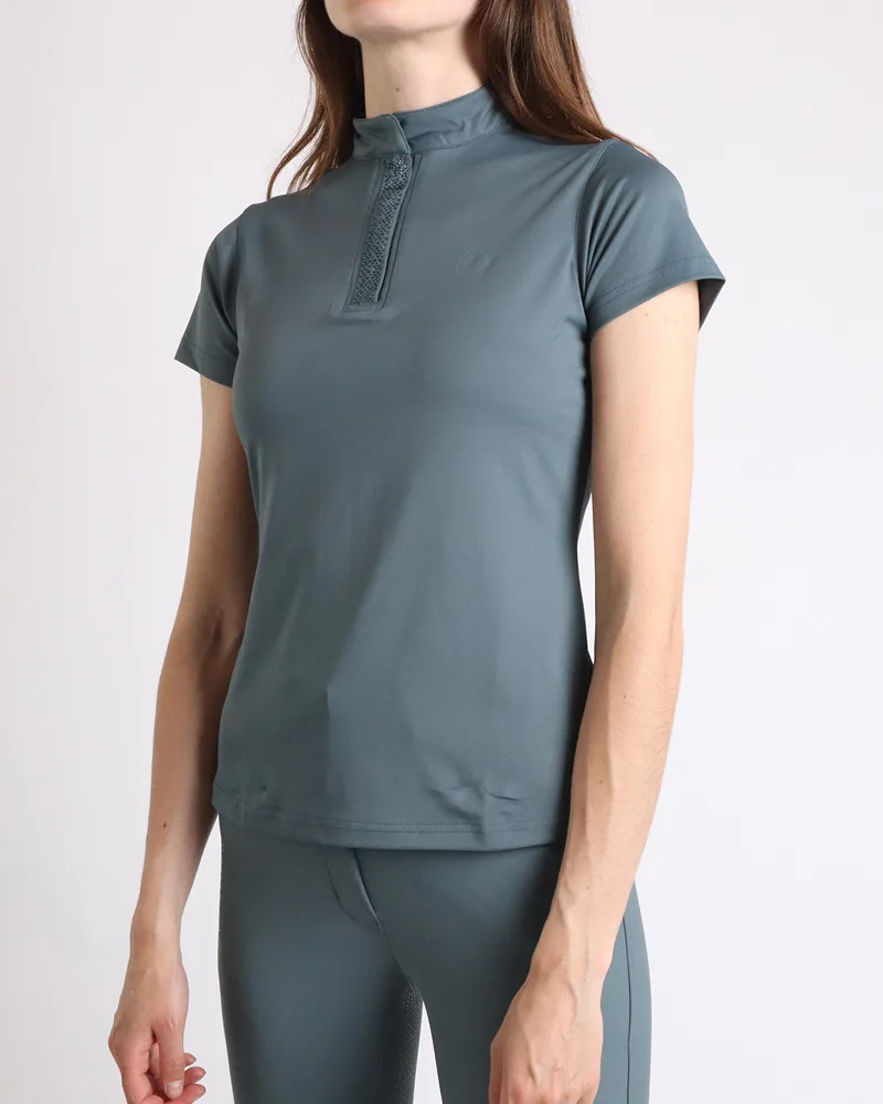 Vi introducerer i vores SS24 Update kollektion den populære Briella polo i helt nye flotte farver, som matcher resten af farvepaletten: hvor stil møder ydeevne i perfekt harmoni. Denne polo er lavet af vores eget MonTech-stof og omdefinerer høj ydeevne, mens den holder dig ubesværet chik i sadlen. Prydet med tone-in -farvede krystaller foran og med en skjult kvart lynlås i halsen, denne polo udstråler diskret glamour, hvilket gør den til en tidløs tilføjelse til din ridegarderobe.