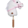 Kæphest med håndtag og tøjler med lydfunktion i øret (grædende og galopperende) Batteridrift (3x LR 44 knapbatterier, inkluderet) Polyester hoved Træ Længde ca. 100 cm afskruelig træstang