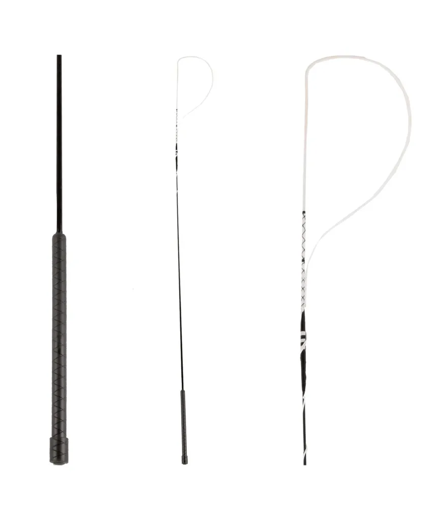 Glat lakeret kørepisk lavet af glasfiber. Plasthåndtag og spundet bue. Slaglængde: 80 cm
