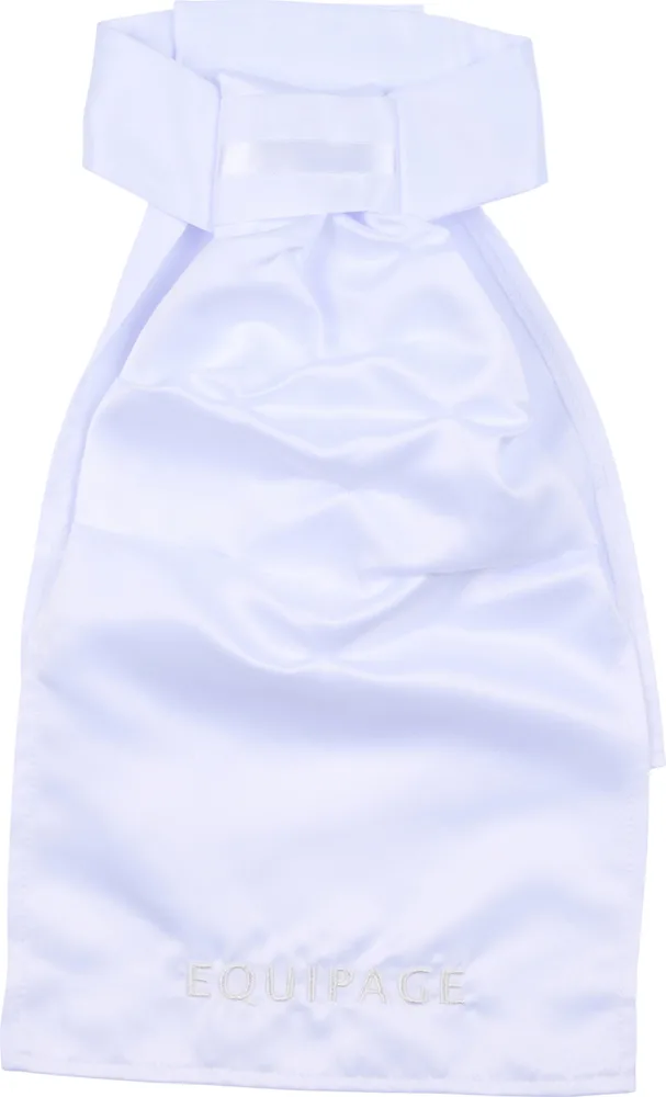 Færdigbundet satinplastron med velcrolukning bagpå. Med sølvlurex logo broderi.