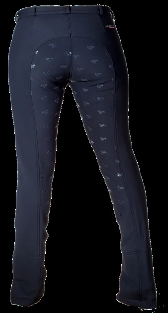 Varme og komfortable vinterridebukser med et hestemønster i silikone i sæde og ben for at give superbt greb i sadlen. Softshell stoffet er elastisk, vind- og vandafvisende og har en varm fleece isolering på indersiden. 2 lynlåslommer foran til mobiltelefon eller lignende.