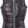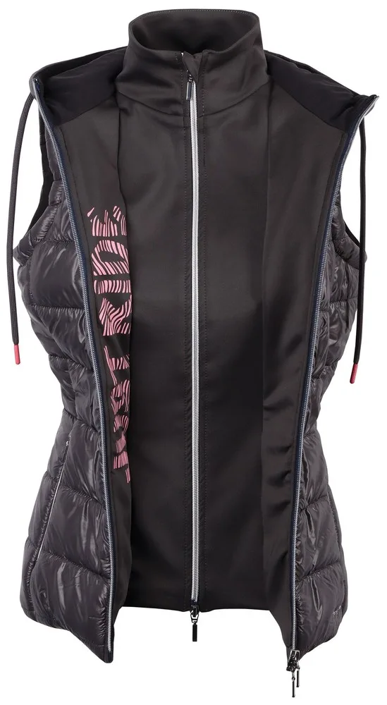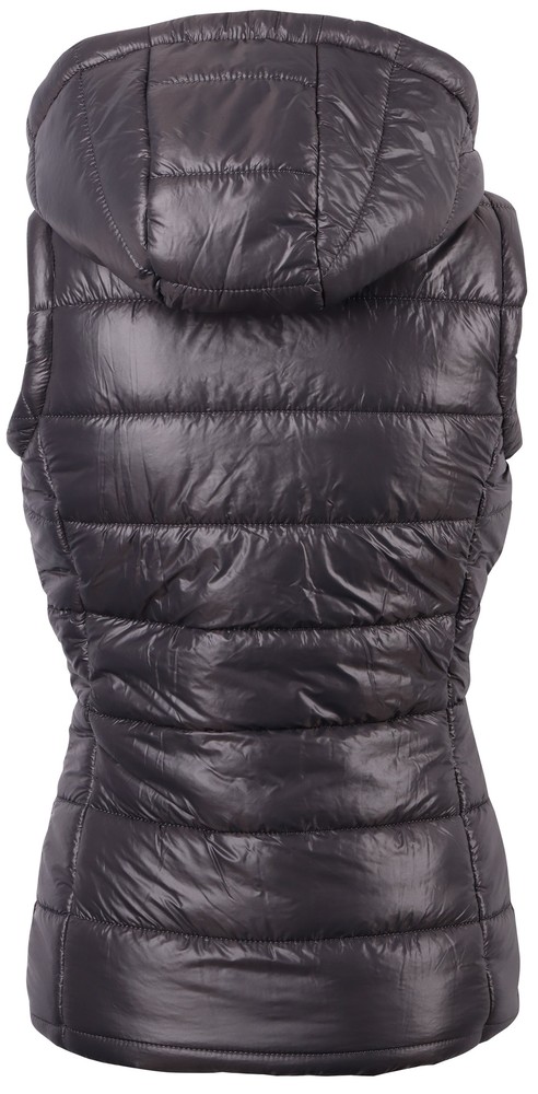 Bodywarmer lavet af skinnende satin med hætte, dobbelt lynlås, snøre, to lynlåslommer og Just Ride-logoet på indersiden af lynlåsen foran.