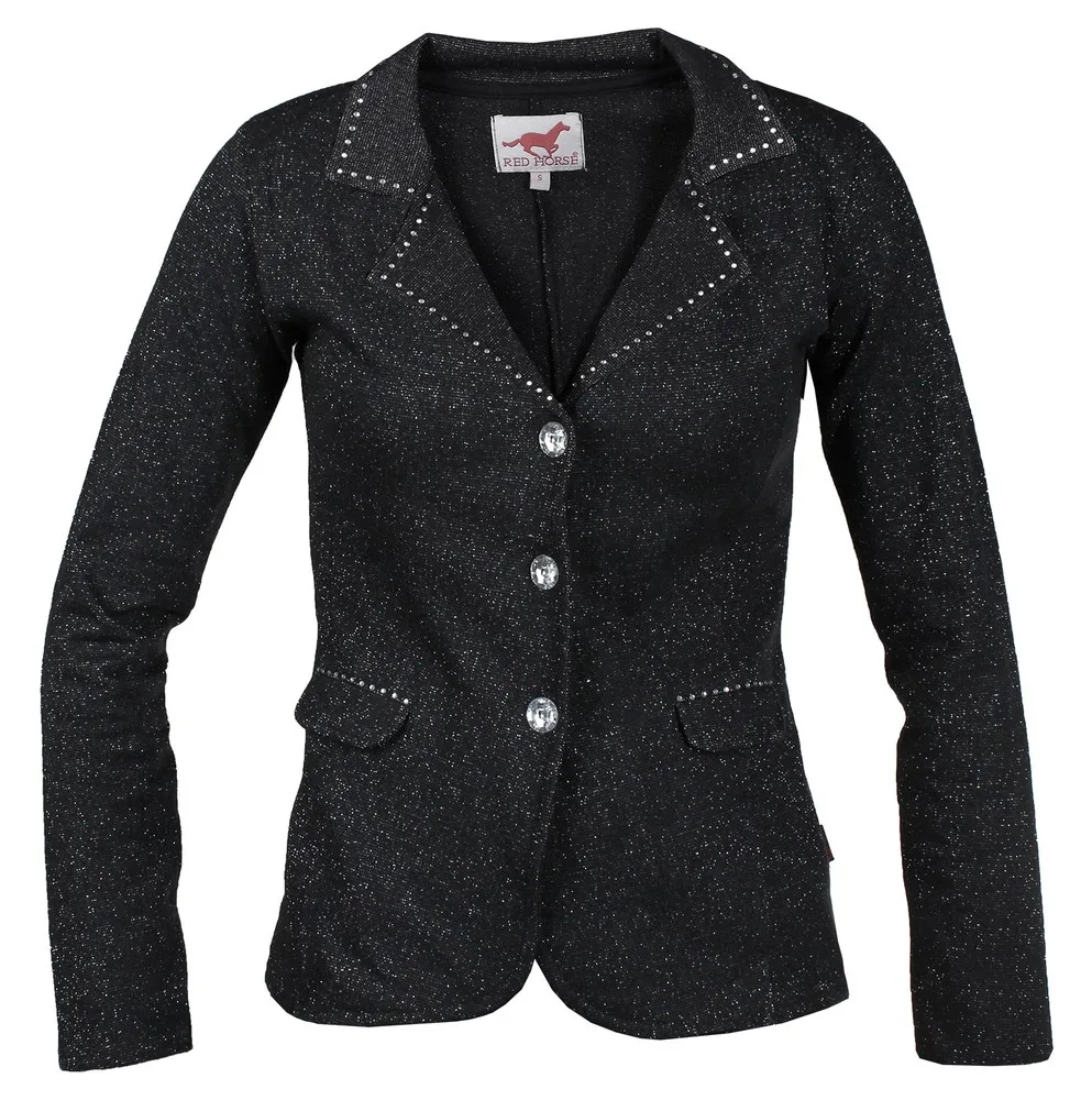 Stævne jakke i 80% bomuld og 20% Lurex i sort glimmer stof med Fleeceagtig inderside. Bling på revers og lomme kanter og store bling knapper.