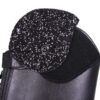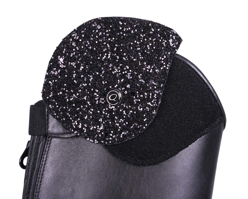 Tilpas denne ridestøvle til din stil! Toppen har en velcro-løsning, så design kan fastgøres til ridestøvlen. Ridestøvlen Romy kommer med et glimmerdesign. Andre designs fås separat. Ridestøvlen har lynlås med elastikindsats bagpå og en elastisk snøring foran.