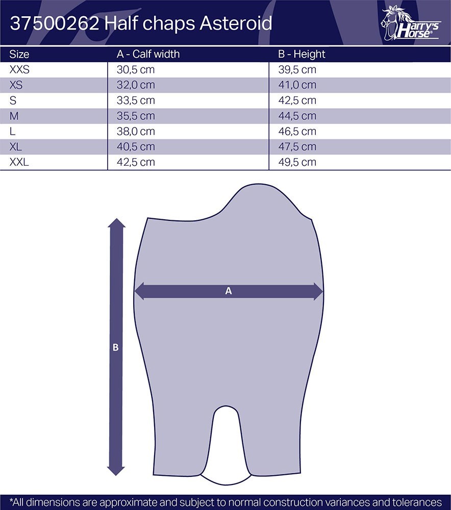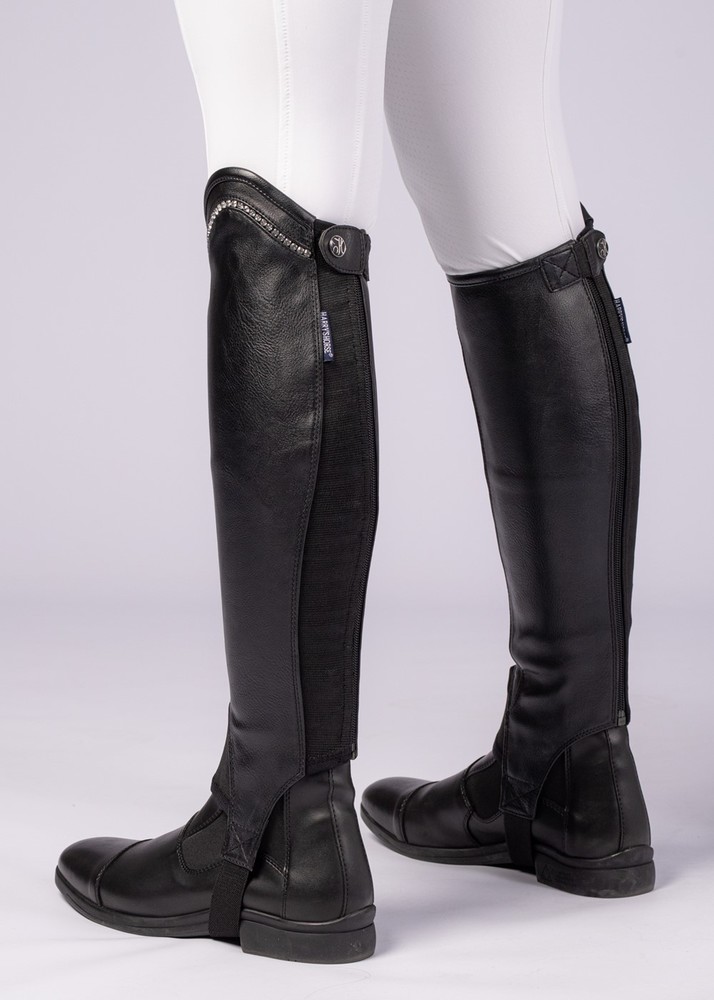 Luksus mini chaps med perforeret syntetisk læder og dressurbue med krystaller. Chapsene er udstyret med en elastisk indsats ved læggen, lang lynlås bagpå og beskyttelsesklap.