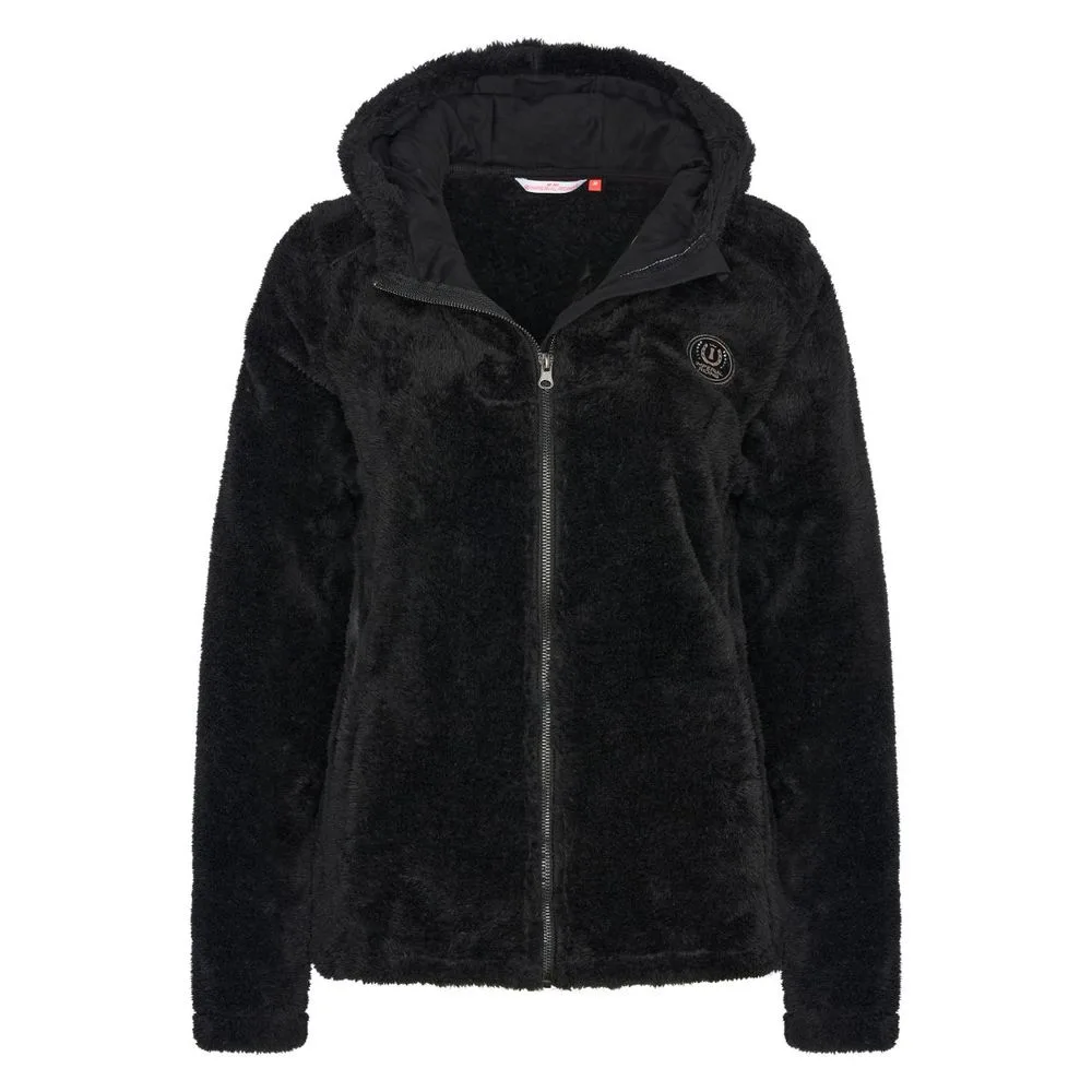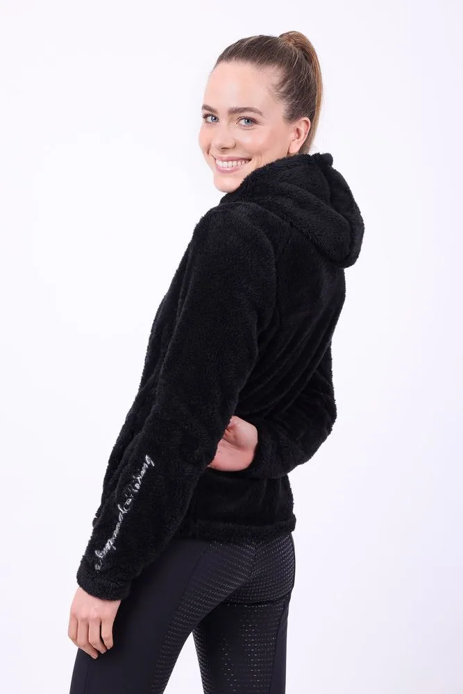 “Hold dig lun og stilfuld i sadlen med vores hætteklædte pelsede fleecejakke. Med en 2-vejs lynlås, hagebeskytter og mærkedetaljer for et chict-look.”